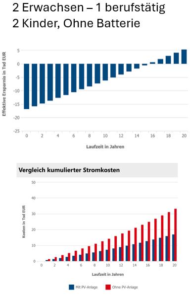 Wir haben die Wirtschaftlichkeit von PV-Anlagen für drei unterschiedliche Familiengrößen untersucht, sowohl ohne als auch mit Speicher und Elektroautos. Amortisationszeitraum: 12-16 Jahre bei allen drei Größen.