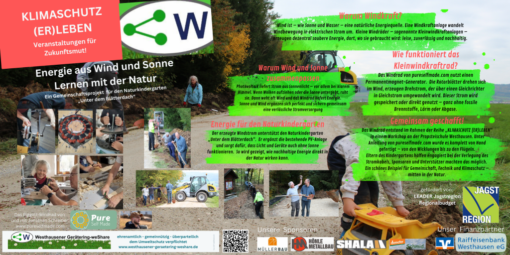 Zuletzt entstand in der Propsteischule ein Kleinwindkraftrad im Selbstbau mit Jonathan Schreiber von pureselfmade, das nun den Naturkindergarten „Unterm Blätterdach“ mit Strom versorgt.