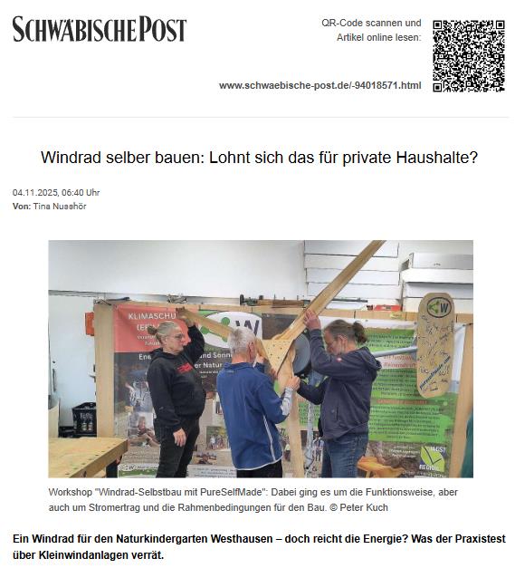 Im Workshop wird von der Gruppe unter Anleitung von Jonathan Schreiber vom Projekt PureSelfMade ein voll funktionstüchtiges Kleinwindrad in handwerklicher Arbeit gebaut. Sämtliche Teile des Windrades, vom Generator bis zu den Rotorblättern aus Holz, werden im Workshop selbst gefertigt. Dabei werden mehrere technische Fachbereiche und handwerkliche Arbeitstechniken auf anspruchsvolle Weise in einem Projekt vereint und Fachwissen vermittelt.